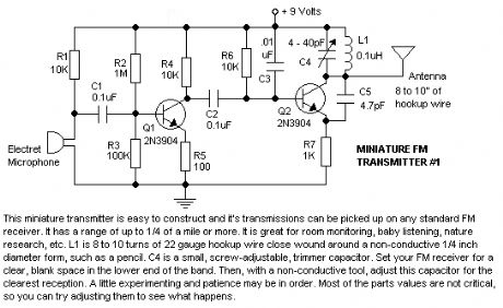 This miniature transmitter is easy to construct and it's transmissions can be picked up on any standard FM receiver. It has a range of up to 1/4 of a mile or more. It is great for room monitoring, baby listening, nature research, etc. L1 is 8 to 10 turns of 22 gauge hookup wire close wound around a non-conductive 1/4 inch diameter form, such as a pencil. C4 is a small, screw-adjustable, trimmer capacitor. Set your FM receiver for a clear, blank space in the lower end of the band. Then, with a non-conductive tool, adjust this capacitor for the clearest reception. A little experimenting and patience may be in order. Most of the parts' values are not critical, so you can try adjusting them to see what happens.