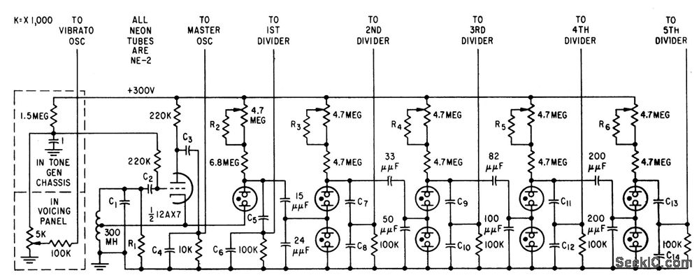 Each of 12 organ tone generators has four pairs of neon tubes in series, each pair shunted by two series capacitors. With signal taken from common point between capacitors, sufficient insolation exists to prevent feedback and spurious tones in output. Master oscillator provides initial sync for neon-lamp divider chain. Article gives capacitor values for each musical note.-R. H. Dorf, Electronic Organ Uses Neon Tone Generators, Electronics, 31:35, p 36-41.