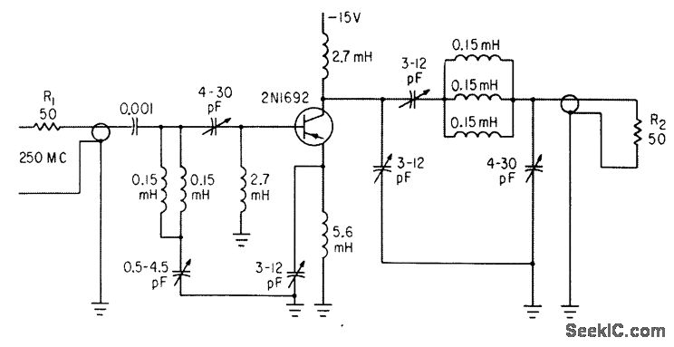 New operating mode increases h-f gain more thon 20 db, reduces interstage matching problems, improves selectivity and stability, and cuts cost. Based on neutralizing of emitter-circuit inductances with small variable capacitor from emitter to ground and r-f choke to provide d-c path from emitter to ground. Technique works best above 100 Mc.-Extend Transistor Frequency, Electronics, 34:44, p 25.
