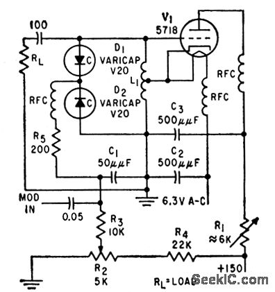 Modulator consists of two variable-capacitance diodes in series to r-f and in parallel to audio modulating signals and d-c bias. Frequency deviation is 28 Mc peak-to-peak with modulating signals less thon 28 v and negligible modulating power.-C. Arsem, Wideband F-M with Capacitance Diodes, Electronics, 32:49, p 112-113.