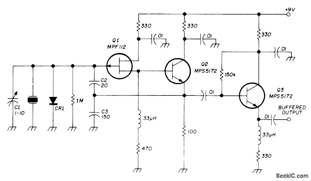 Modification of basic Colpitts crystal oscillator has excellent load capacitance correlationand temperature stability. Crystal will oscillate very close to its series resonant point. Component values are optimized for 10-20 MHz. Emitter-follower Q2 provides power gain for feedback energy and gives high crystal activity without changing phase angle of signal. Output buffer Q3 prevents loading of oscillator. Q1 is low-cost Motorola JFET, but practically any other JFET will work CR1 is 1N914 or 1N4148.-D. L. Stoner, High-Stability Crystal Oscillator, Ham Radio, Oct. 1974, p 36-39.