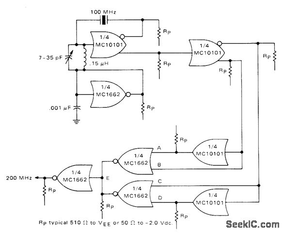 One section of Motorola MCI0101 is connected as 100-MHz crystal oscillator having crystal in series with feedback loop. LC tank circuit tunes 100-MHz harmonic of crystal and can be used to adjust circuit to exact frequency. Second section of IC serves as buffer and gives complementary 100-MHz signals for frequency doubler having two MC10101 gates as phase shifters and two MC1662 NOR gates. Outputs of MC1662s are wired-OR connected to give 200-MHz signal. One of remaining MC1662 gates is used as bias generator for oscillator.-B. Blood, IC Crystal Controlled Oscillators, Motorola, Phoenix, AZ, 1977, AN-417B, p 5.