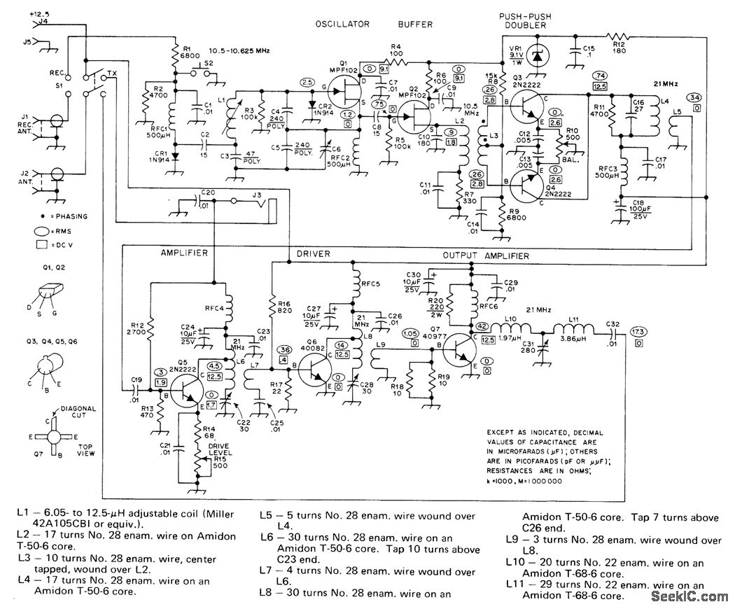 Developed for low-power CW work in 15-meter amateur band. Colpitts oscillator Q1 runs continuously at 10.5-10.625 MHz during transmit and receive, for good frequency stability, so VF0 frequency must be shifted away from operating frequency during receive periods. Supply is 12 V at 1.3 A. C6 is 4-53.5 pF. RFC4 is 16turns No. 28 enamel, RFC5 is 11 turns No. 22, and RFC6 is 6 turns No. 22, each on Amidon FT-50-61 core. Article covers construction and tune-up.-J. Rusgrove, A 15-Meter Goober Whistle, QST, Jan. 1976, p 16-19.