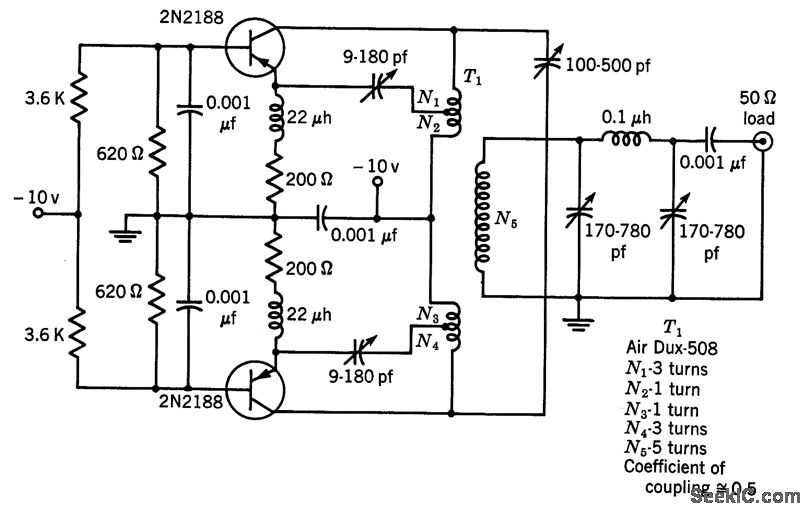 Delivers 75 mw to 50-ohm load, through network. –Texas Instruments Inc., Transistor Circuit Design, McGraw-Hill, N. Y., 1963, p 318.
