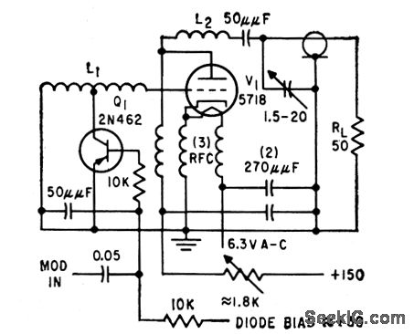 Wideband frequency modulation of 400-Mc distributed-parameter Colpitts oscillator is obtained with symmetrical transistor in modulator. Q1 is equivalent to two reverse, biased diodes in series for r-f and in parallel with respect to modulating signals and d-c bias.-C. Arsem, Wideband r-m with Capacitance Diodes, Electronics, 32:49, p 112-113.