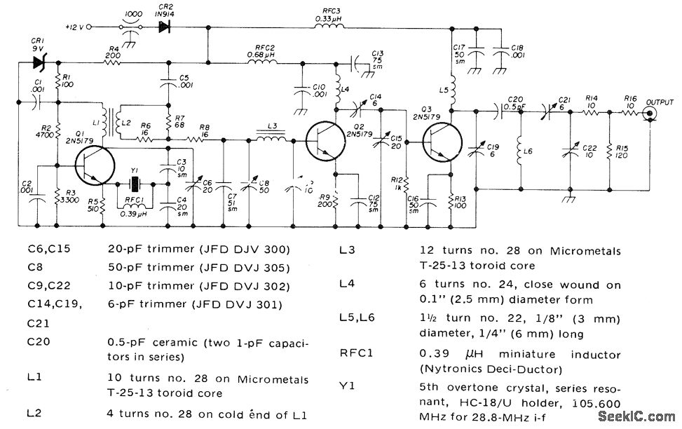 Uses 105.6-MHz crystal oscillator followed by frequency-doubling stages to give desired output for driving external diode-type tripler for which circuit is also given in article, Developed for use in 1296-MHz SSB transceiver for 23-cm amateur band.-H. P. Shuch, Easy-to-Build SSB Transceiver for 1296 MHz, Ham Radio, Sept. 1974, p 8-23.