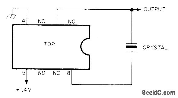 Simple crystal oscillator using National LM3909N is adjusted to exactly desired frequency with capacitor in series with pin 8. Drain from AA cell is less than 0.5 mA at 1.2 V. Use 465-kHz crystal and couple oscillator to receiver input with 100-pF capacitor. With 100-kHz crystal, circuit will generate strong harmonics beyond 30 MHz; to zero-beat with WWV, use about 10 pF in series with erystal.-I. Queen, Simple Crystal Oscillator, Ham Radio, Nov, 1977, p 98.