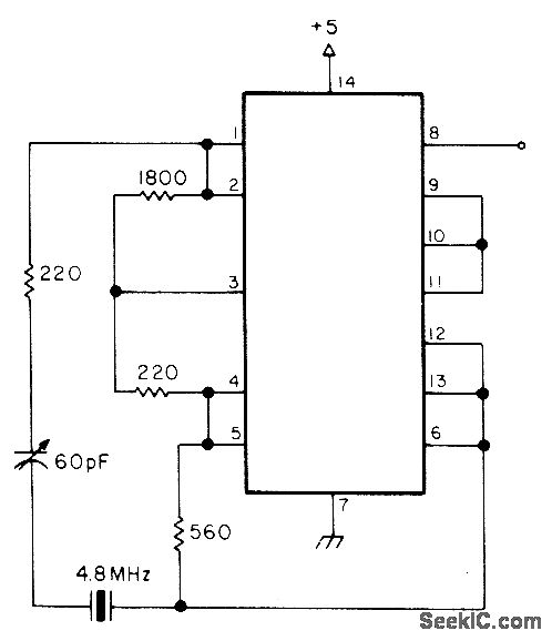 Uses all four sections of 7400 quad dual-input NAND gate to give 4.8 MHz output at pin 8, as harmonic-rich square wave. Can cause severe television interference during testing. Article gives five other crystal oscillator circults using same IC.-A. MacLean, How Do You Use ICs?, 73 Magazine, Oct. 1976, p 38-41.