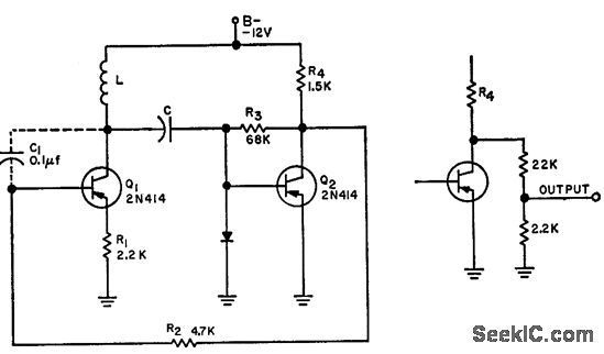 Overcomes low-frequency problems of wide-range oscillators by using tank both for controlling frequency and coupling signal to next stage. Frequency is stable over wide variations in d-c voltage and temperature, yet circuit is inexpensive. Alternative output coupling shown is useful for driving varying loads.-J. Freeman, Low-Frequency C-Coupled Oscillator, EEE, 11:7, p 27-28.