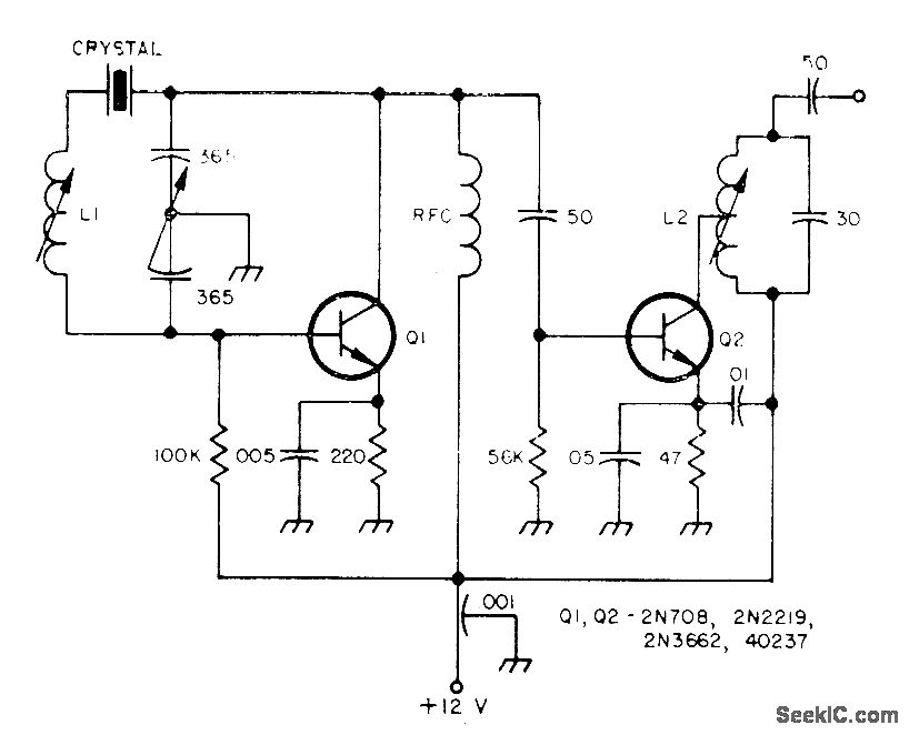 Tuning two-gang 365-pF variable capacitor through its range provides frequency change up to 5 kHz in output of 8-MHz crystal oscillator. L1 is 16-24 μH Miller 4507, and L2 is 40 turns No.36 tapped at 13 turns, on 1/4-inch slug-tuned form.-Circuits, 73 Magazine, Jan. 1974, p 128.