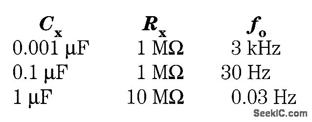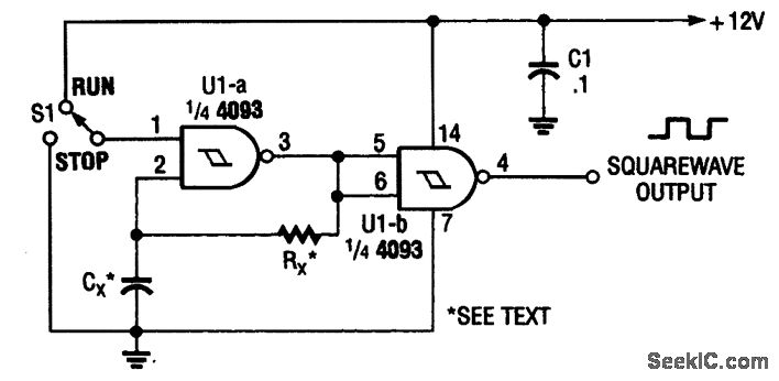 In this circuit,two gates from the quad 4093 package are used to form a simple astable squarewave oscillator.The values for RX and CX are approximately as follows∶These values can be scaled for other frequencies.