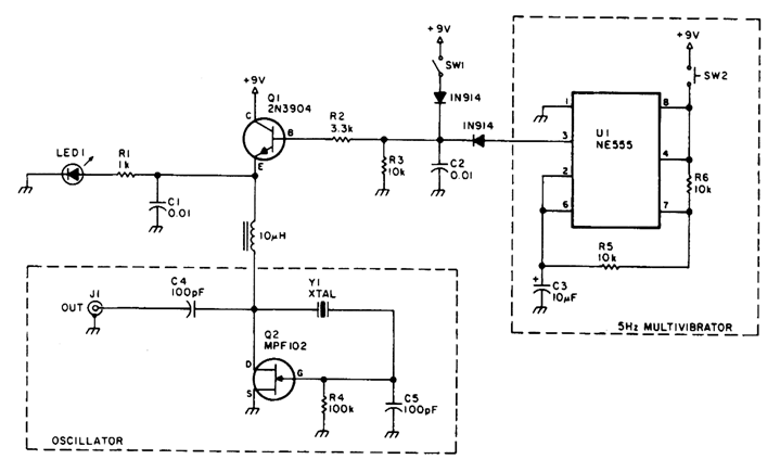 A useful marker oscillator can be made using an NE555 to pulse the oscillator at an audio rate. This makes it easy to find the signal in the presence of interference. The crystal can be any suitable frequency from 1 to 30 MHz.