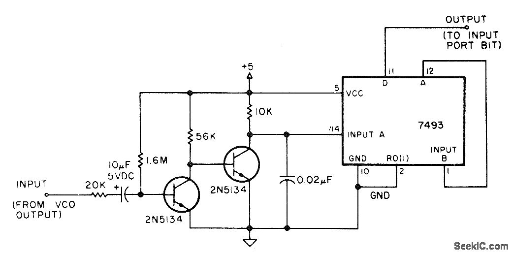 Simple buffer/counter provides accurate calibration of FSK circuit used in cassette interface of 8080 microprocessor to generate mark and space frequencies. Audio FSK waveform is squared and divided down in 7493 4-bit counter. Resulting pulses are fed to input port of microprocessor for software pulse counting. Software sets VCO frequency, waits until pulse starts, counts each pulse occurrence, and displays resultant count.Each 7493 count is 29 Hz or 14.5μs, so 371 counts correspond to 2975 Hz for space. Mark frequency of 2125 Hz gives pulses separated by 519 counts.-D. R. Bourdeau, Cassette Interface First Aid, Kilobaud, July 1977, p 49.