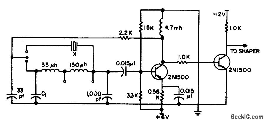 Gives high stability from 800 kc to 3 Mc, from 0 to 65℃ with either crystal or capacitor. Optimum operating frequency can be found and utilized by changing capacitor value C1 in range up to 500 pf, while awaiting delivery of CT-cut crystal at desired frequency. -T. Asai, Crystal-or-capacitor Oscillator, EEE, 12:3, p 72.