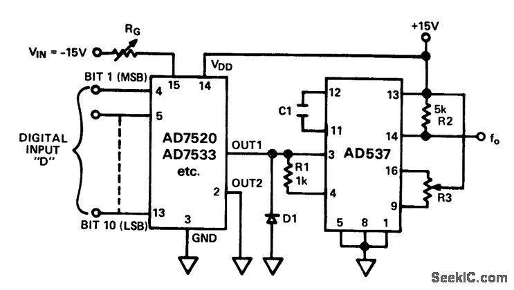 Digitally programmed oscillator. The circuit uses an AD537 monolithic V/F converter and an AD7520 multiplying D/A convener. It is a programmable square wave frequency source with excellent linearity in the range of0 to 100 kHz (courtesy Analog Devices, Inc.).