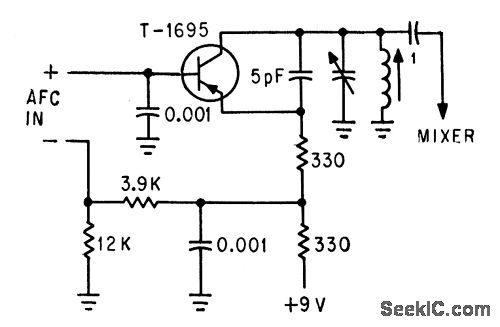 Error signal, usually derived from external discriminator, is applied in series with base bias network to give sensitivity of about 1.5 Mc per v and nearly straight voltage-frequency characteristic.-T. P. Prouty, Using Varactors to Extend Frequency-Control Range, Electronics,36:45, p 48-49.