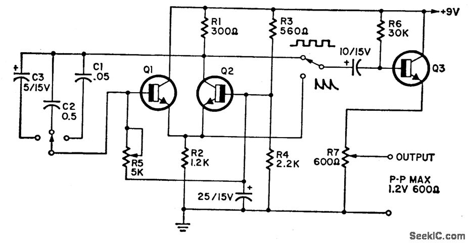 The circuit covers 15 Hz-30 kHz and is useful as a function generator. The 2N2926 or equivalent transistors can be used.