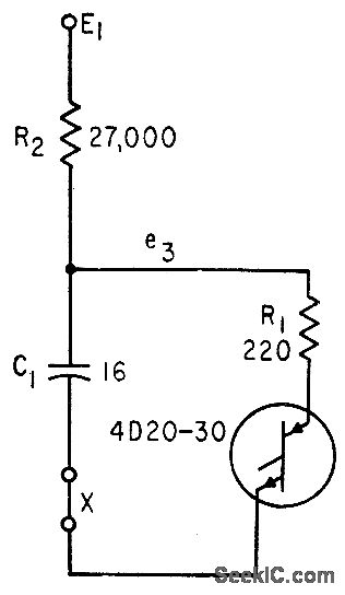If circuit is broken at X, discharge current of C1 can be used to shut off transistor stage.-A. G. Lloyd, Overload Protection for Transistor Voltage Regulators, Electronics, 33:52, p 56-59.