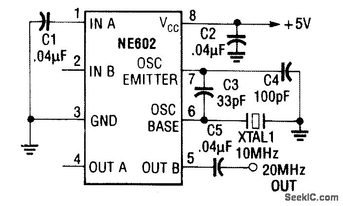 This frequency doubler produces a sine wave at twice the frequency of XTALl. Notice that the output is taken only from OUT B (pin 5), while OUT A (pin 4) is left open.