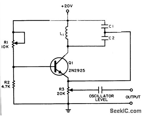 Control R1 may be used to adjust base bias for maximum-amplitude output. The circuit was operated at 50 kHz with L1 = 10mH, C1 = 3500 pF, and C2 1500 pF.