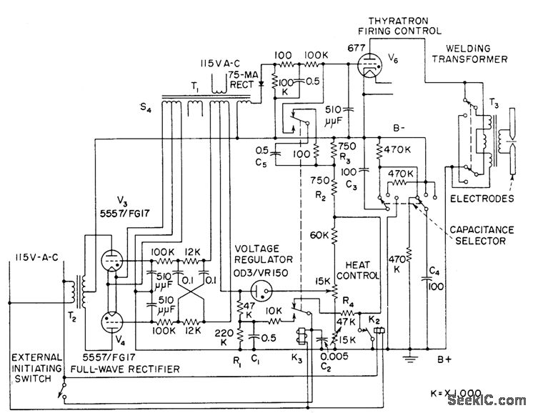 Permits precise control of high-energy capacitor discharge used in welding extremely thin and highly conductive foils or fine wires. Heat control provides range of 650 to 1,500 v for level at which energy is stored, and selector switch gives choice of 50, 100, and 200 mfd for storage capacitor.-J. Markus, Handbook of Electronic Control Circuits, McGraw-Hill, New York, 1959, p 321.