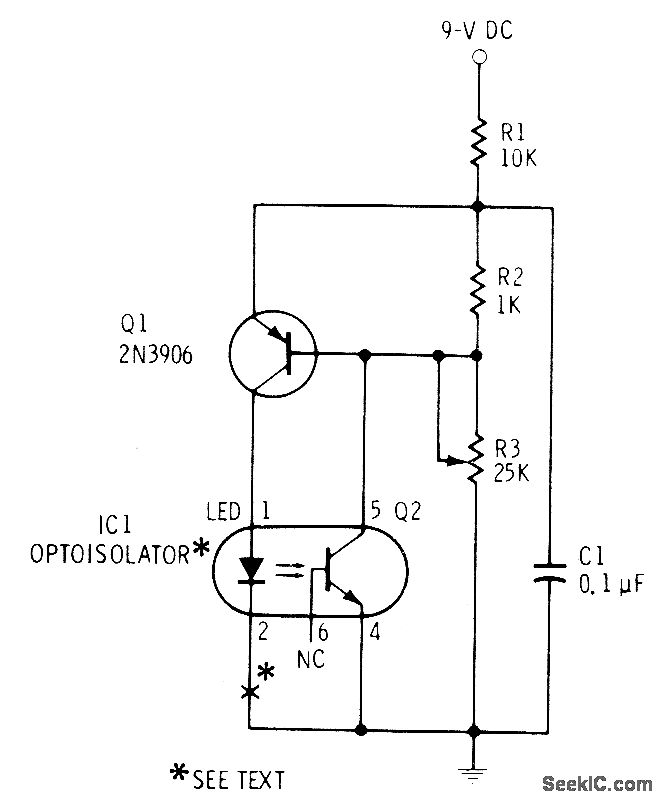 Covers frequency range of about 3.2-8 kHz with values shown. WilI drive Ioudspeaker inserted at point X. For lower frequency (range of 120-1800 Hz) and Iouder sound, change C1 to 1 μF.Negative-resistance portion of circuit indudes Q1, Q2, LED, R2, and R3. Optoisolator can be MCT-2 or equivalent.-F. M, Mims, Electronic Circuitbook 5: LED Projects, Howard W. Sams, Indianapolis, IN, 1976, p 26-29.