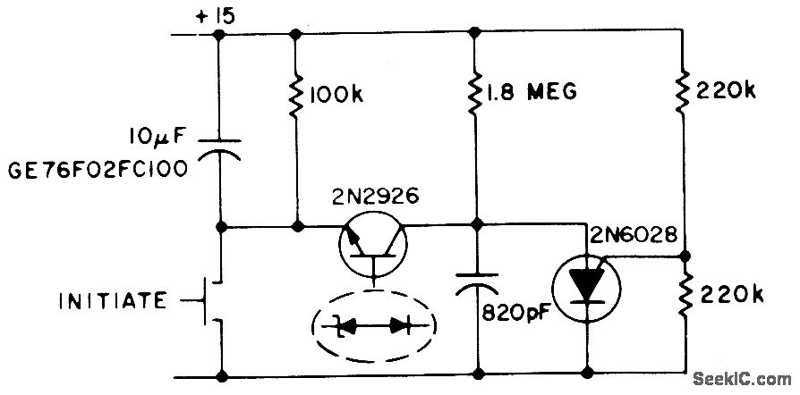 This circuit operates as an oscillator and a timer. The 2N6028 is normally on due to excess holding current through the 100 k resistor.