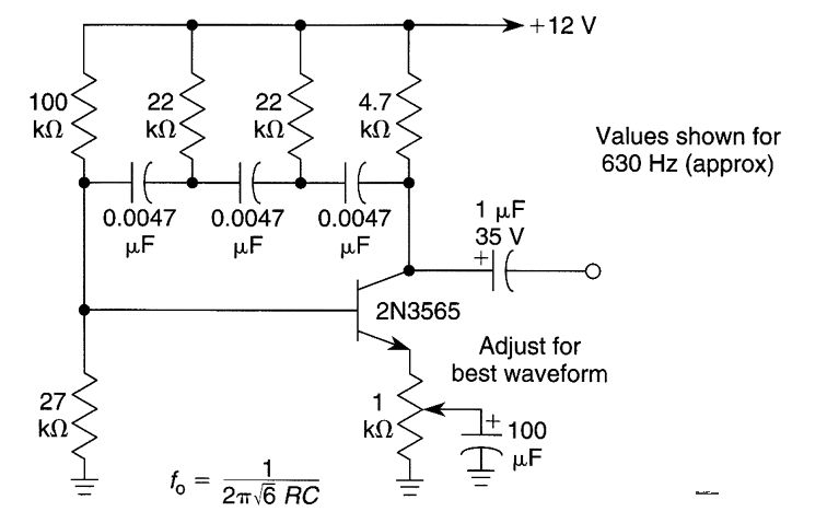 A single transistor is used as an active element in an RC phase shift oscillator.