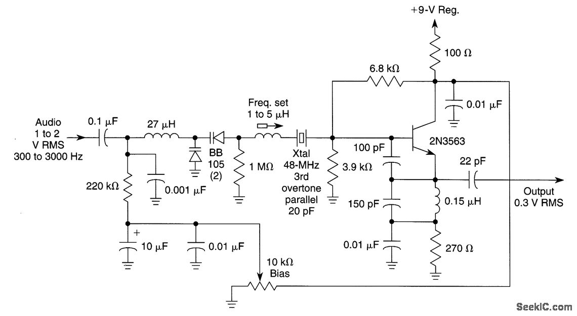 This crystal oscillator produces a good FM signal that can be tripled to 146 MHz and produces a clean 5-kHz deviation signal for FM voice. The bias control is adjusted for cleanest audio while the 1-to 5-pH cqil is adjusted to set the oscillator frequency to the exact setting required.