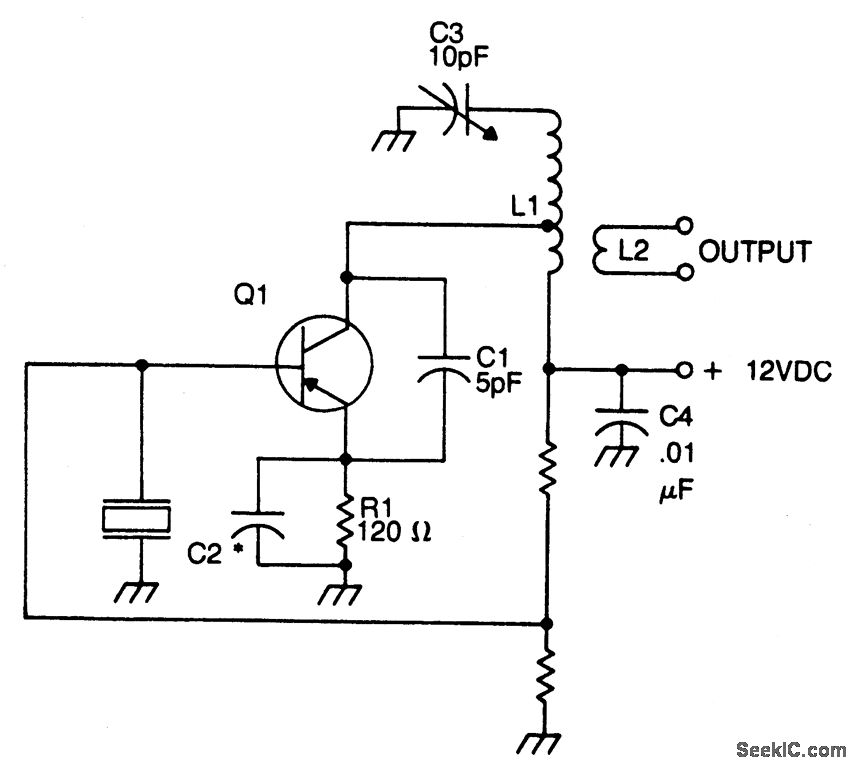 The crystal element in this circuit is con-nected directly between the base and ground.Capacitor C1 is used to improve the feedback due to the internal capacitances of the transis-tor. This capacitor should be mounted as close as possible to the case of the transistor. The LC tank circuit in the collector of the transistor is tuned to the overtone frequency of the crystal.The emitter resistor capacitor must have a capacitive reactance of approximately 90 ohms at the frequency of operation. The tap on induc-tor L1 is used to match the impedance of the collector of the transistor. In most cases, the optimum placement of this tap is approximately one-third from the cold end of the coil. The placement of this tap is a trade-off between stability and maximum power output. The out-put signal is taken from a link coupling coil, L2, and operates by transformer action.