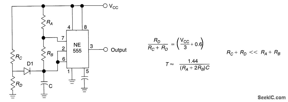 Using R1, R7, and D1 to preset C1 to one third of the supply voltage, this circuit avoids a longer first cycle period than subsequent cycles.