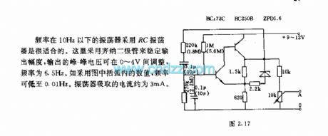 The oscillator with frequency below 10Hz is very appropriate to use RC oscillator. Zener diode is used here to stabilize the rate, the output peak - peak voltage can be adjusted between 0 ~ 4V , frequency is 6.5HZ. If it uses the value in the arc, the frequency can be as low as 0.01HZ. Oscillator's absorbing current is about 3mA.