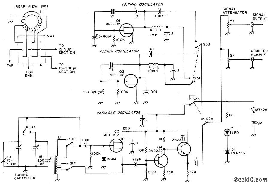 A variable oscillator covers 3.2 to 22 MHz in two bands-providing coverage of 80 through 15 meters plus most crystal-filter frequencies. Optional455 kHz and 10.7 MHz crystal oscillators can be switched on-line for precise tf alianmen' generator output is on the order of 4 volts p-p into a 500 ohm load. A simple voltage-divider attenuator controls the generator's output level, and a second output provides sufficient drive for an external frequency counter.