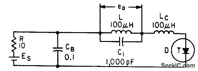 Series filter selects desired frequency and rejects harmonics from pulse-shaped output of basic tunnel-diode relaxation oscillator. Values shown give 0.45 Mc, constant within 0.05 Mc over bias range of 100 to 400 mv.-Wen-Hsiung Ko, Designing Tunnel Diode Oscillators, Electronics, 34:6, p 68-72.