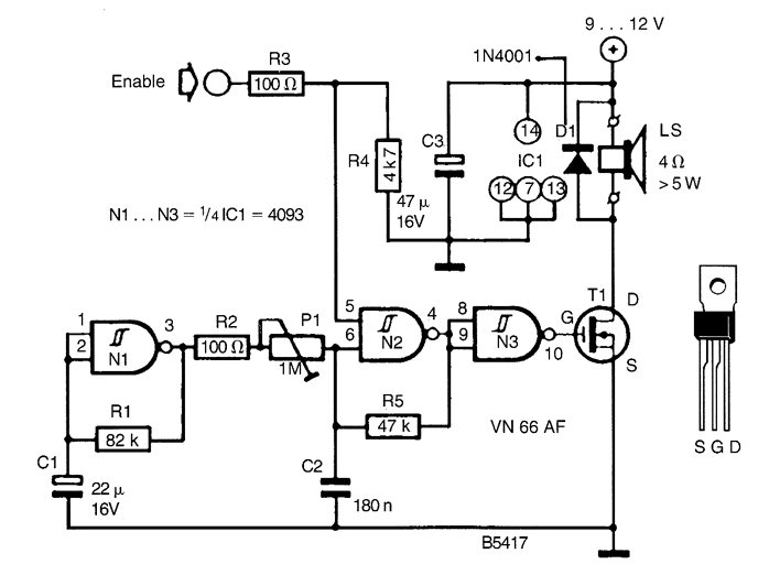 A CD4093 chip and a few components make up a siren oscillator, which drives power MOSFET T1. A 4-Ω speaker is driven directly from this device. The siren is enabled by a logic high applied to the ENABLE input.
