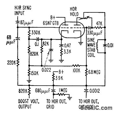 Sine-wave stabilization or ringing coil pulls Synchroguide horizontal oscillator frequency back to correct value when lube or other components drift in value.-W. E. Babcock, Unusual Tube Effects Cause Circuit Troubles, Electronics, 31:37, p 90-93.