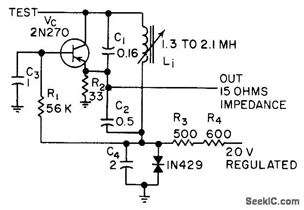 Provides constant-amplitude carrier for data reduction system, at 0.5 V rms with amplitude stability of 0.l% and frequency drift below 0.25% for temperature range of 30 to 50℃.-L. H. Dulberger, Transistor Oscillator Supplies Stable Signal, Electronics, 31:5, p 43.