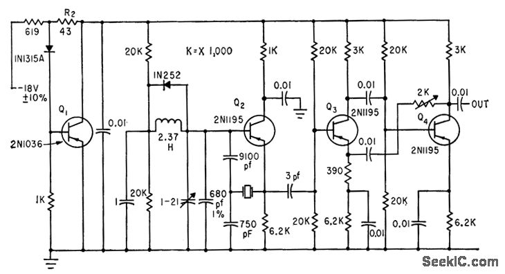 Crystal operates at series resonance in feedback path between emitter of Q2 and tank tap. Q1 is shunt voltage regulator providing power-supply isolation. Two-stage feedback amplifier Q3-Q4 provides output impedance of about 150 ohms when R1 is adjusted for 0.5-V peak-to-peak output swing.-J. W. Hamblen and J. B. Oakes, Instrumentation and Telemetry of Transit Navigational Satellites, Electronics, 34:32, p 148-153.