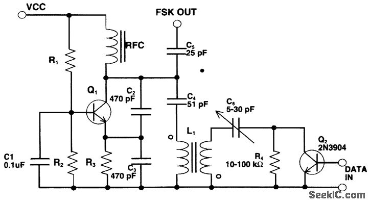In frequency-shift keying (FSK) applications, when modulating high data rates, coupling data to the varactor can pose a problem. A duplex filter is necessary to prevent RF loading or leaking of the oscillator tank while transferring the fast data edges to the varactor. These two constraints contradict one another-especially when the edge's rise time approaches that of the carrier frequency. If an RF choke or a large-value resistor is used to inject data to the varactor, then the edges of the data will be severely distorted by RC or inductive-capacitive (LC) time constants. The loss of these rise times can result in duty-cycle distortion as seen by the threshold level detector in the receiver. To improve upon the traditional VCO techniques, varying the inductor provides increased tuning sensitivity and better resonator Q. Inductive tuning uses the coupling or leakage inductance characteristics of a transformer. Thus, tuning capacitor C4 can be changed to a fixed, high-quality capacitor. Use of a negative -temperature -coefficient capacitor here can balance out the active device's capacitance variation with temperature. The tuning inductor (L1) is now a transformer. At about 48 MHz, it is a nine-turn, center-tapped coil of AWG28 wound on a 725-10 Micrometals core. Other transformers also can be implemented, depending on operating frequencies and performance requirements. The Q for this inductor is about 100, which is more than sufficient to isolate the active device to prevent its pulling the oscillator tank over the extended temperature range of -40 to 85℃. The inductance variation or stability with temperature is dependent on the core material of L1.