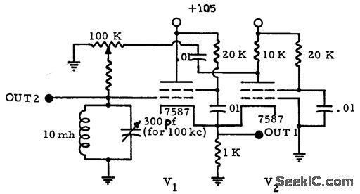 Excellent frequency and amplitude stability is accomplished by eliminating all grid current in tank circuit and by isolating tank from driving tube by means of resistive degeneration. If very pure sine wove is required, grid of V1 should be coupled to high-impedance load that is equivalent constant resistance, because either reacyive or variable loads will impair stability.-J. C. Davis, Stable Oscillator Circuit, EEE, 11:2, p 26.
