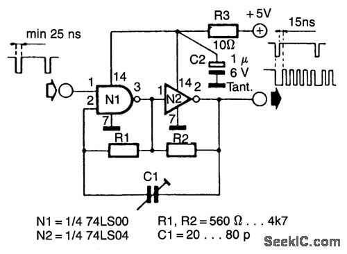 Oscillators that generate a predetermined number of pulses are often required in applications such as video work. This oscillator starts 13 ms after the control signal goes high and stops immediately when the input signal goes low.