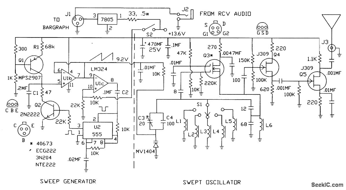 Transistor Q1 acts as a constant-current generator, charging capacitor C1 at a rate determined by the value of R1. The high input impedance of U1b ensures that the constant-current generator is not excessively loaded and forwards the voltage level of C1 to U1c. U1c is configured as a comparator, and output pin 8 goes low when pin 9 rises above 9 V. This switching action applies a trigger pulse via capacitor C2 to activate the monostable multivibrator, U2. The resulting high pulse from pin 3 of U2 provides a discharge path for capacitor C1 through turned-on transistor Q2. A continuous sweep ramp with reset is produced at pin 7 of Ulb at a rate determined by RIC1 (approximately 75 Hz). The swept oscillator section consistsof a dual-gate MOSFET transistor in a Colpitts configuration, followed by a buffer amplifier that provides the RF from the selected frequency range to an output amplifier and short antenna. As the output sawtooth waveform from U2, pin 7, is applied to the varactor, the capacitance of the tank circuit decreases from approximately 62 pF at the low end of the ramp to a very low value at the maximum sweep level of about 9.2 V. The on-off switching action of the sweep waveform modulates the generated RF to produce an obnoxious buzz, which is easy to differentiate from other low-level signals at the selected receiver frequency when adjusting the tuner or antenna.