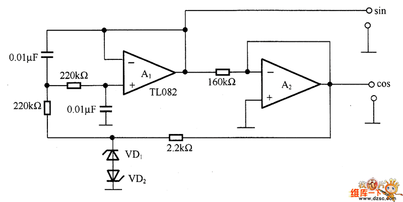 In order to get sine and cosine waves, the circuit is oscillation stabilization circuit without automatic gain control loop, and it can get a stable oscillation output when it is in low frequency. This two-phase oscillator is commonly used as the AC motor signal generator, and it can also be used for the rectangular coordinate transform source or graphic display on the X-Y monitor. In the circuit, A1 constitutex a low pass filter circuit, A2 is an integrator.