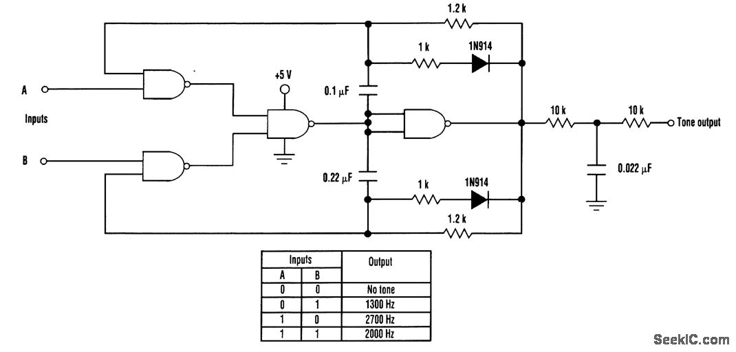 This TTL tone oscillator can generate one of three tones. The tone generation depends on the status of the two input control lines. The design consists of two standard TTL audio tone oscillators merged together using one 7400 TTL chip. Two input lines control the output status. With both inputs low, no output is generated. When input A is high, the high-tone oscillator is gated on. When input B is high, the low-tone oscillator is gated on. With both A and B high, both oscillators are gated on and the output tone generated is midway between the high and low tones. The 1N914 diode in series with a 1-kΩ resistor imposes a 50-percent duty cycle on the waveform. A low-pass filter on the output removes harmonics and mellows the output tone.