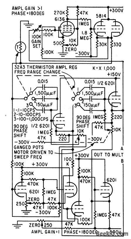 Unknown signal to be analyzed is multiplied independently by each of two output reference signals, A and B. Oscillator uses two 90° phase-shift networks and 180° of phase shift in amplifier. Gain of 0.98 in cathode follower makes circuit accurate over 10:1 frequency range.-T. B. Fryer, Frequency Analyzer Uses Two Reference Signals, Electronics, 32:18, p 56-57.