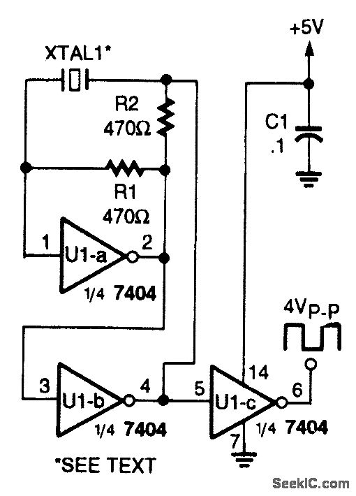This unusual 100-kHz oscillator (whose fre-quency is determined by XTALl) can be used as a marker generator to calibrate the analog diai of a communication receiver, or its output can be fed to a divider courtter to produce a stable lower-fre-quency output for use as a clock-signal generator.