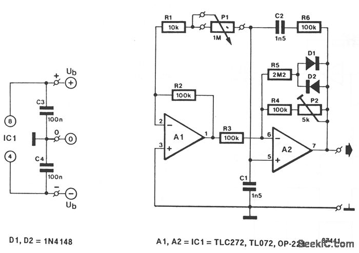 With preset P2 you can adjust the overall amplification so that the output signal has a easonably stable amplitude, 3.5 VPP max., over the entire frequency range. The stated components allow the frequency to be adjusted between 350 Hz and 3.5 kHz.
