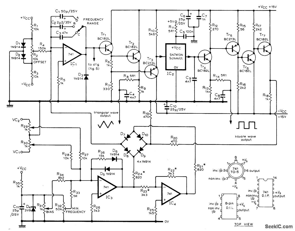 Developed for use in instrument capable of duplicating variety of sounds ranging from bird distress calls and engine noises to spoken words and wide variety of musical instruments. Three-part article gives all circuits and describes their operation in detail. Heart of oscillator is triangle and square-wave generator built around IC Schmitt trigger. Ramp rate and operating frequency are varied by changing drive voltage or gain of integrator. Similar VCO in synthesizer also produces sine, pulse, and ramp waveforms.-T. Orr and D. W. Thomas, Electronic sound synthesize, Wire-less World, part 1-Aug. 1973, p 429-434; Part 3-Oct. 1973, p 485-490.