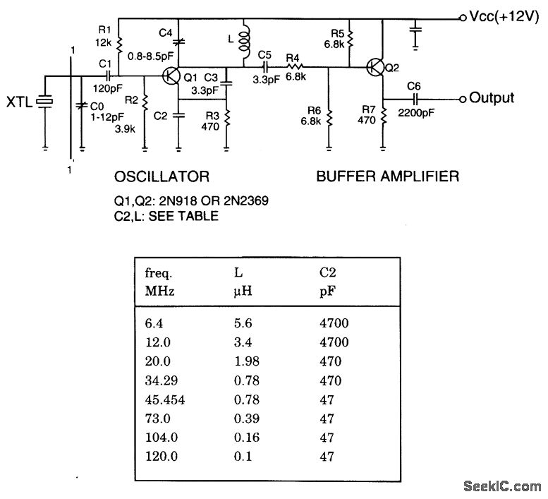 The crystal oscillator operates from 6 to 120 MHz by changing only C2 and L. The table lists component vaues for crystal oscillator at different frequencies.