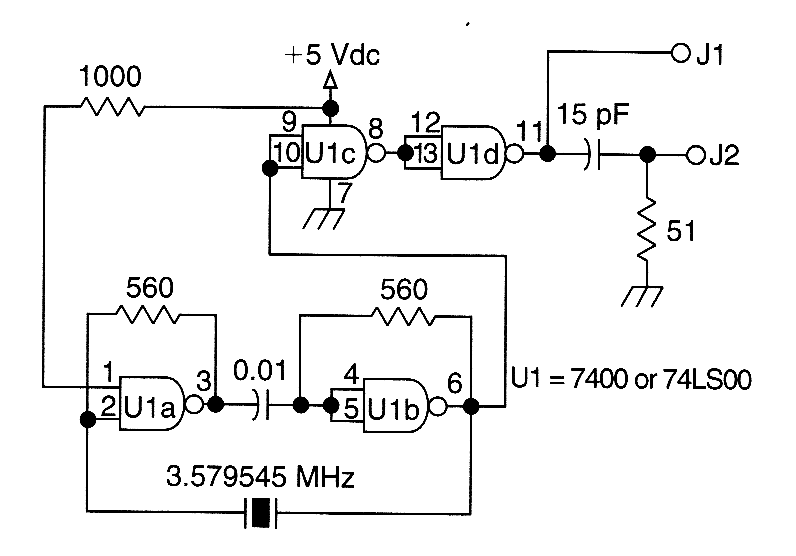 A circuit using one 7400 TTL IC can use crystals of the fundamental type, from 1 to about 13 MHz. Output is rich in harmonics, making this os-cillator useful for calibrations and test applica-tions.